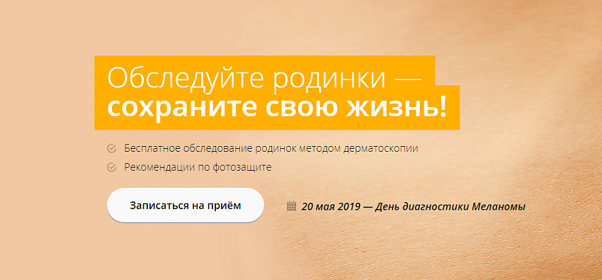 20 мая 2019 в России пройдет единая акция диагностики Меланомы по всей России. Ежегодно в мире диагностируется свыше 232 000 новых случаев заболевания меланомой. Это злокачественная опухоль кожи, которая очень быстро дает метастазы и способна привести к летальному исходу буквально за несколько месяцев. Статистика неумолима: 25% заболевших меланомой не удается спасти из-за позднего выявления. В России эта цифра доходит до 40%, в то время как при ранней диагностике заболевание излечимо в 90% случаев. Среди факторов, способствующих ежегодному росту заболеваемости, - ухудшение экологической ситуации, увеличение проницаемости атмосферы для вредных УФ-лучей, мода на загар и, как следствие, длительное пребывание на солнце без солнцезащитных средств или использование средств с низким фактором защиты, а также активное посещение солярия. Несмотря на важность проблемы, уровень осведомленности населения о роли ультрафиолетовых лучей в развитии меланомы и других раков кожи оста
