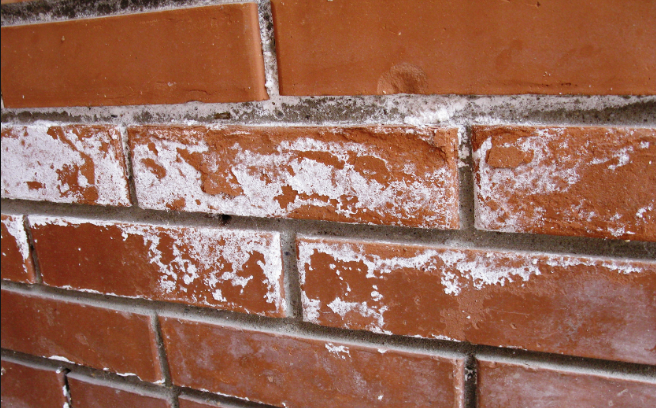 По своей сути, данный пункт вытекает из предыдущего. Весь цемент в России производится из известняка и содержит огромное количество солей. При неправильном подборе песчано-цементной смеси кирпич впитывает в себя избыточное количество воды, а с ним и соли цемента. Излишняя влага выходит через лицевую поверхность на улицу. В растворенном виде соль не страшна. Но, теряя воду, кристаллы соли начинают нарастать друг на друге, расширяясь и создавая избыточные напряжения на лицевой поверхности кирпича. Часто данный процесс приводит к частичным «отстрелам» и даже полному отслоению лицевой пластины.