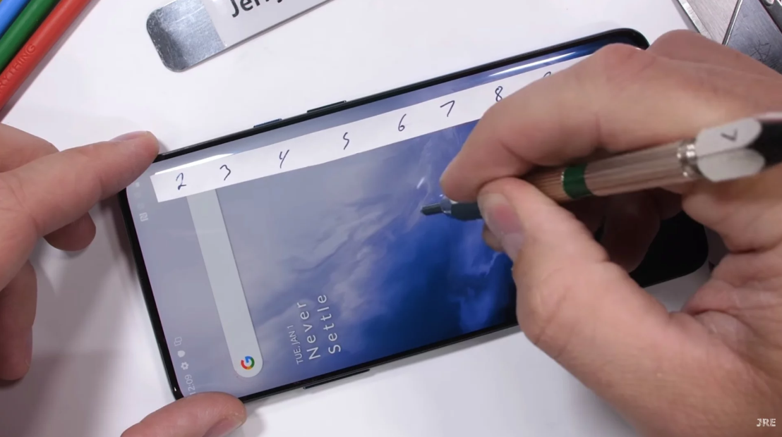 Всё началось, как обычно, с того, что Зак узнал о наличии Gorilla Glass и начал царапать стеклянные панели, а потом оценивать стойкость по шкале Мооса. OnePlus 7 Pro получил 6 баллов, что довольно неплохо. На 7 уровне этой шкалы у смартфонов появляются уже очень глубокие царапины. Ну как царапины? Полноценные трещины, глубокие и царапающие пальцы. Настолько хорош OnePlus 7 Pro, что-либо не царап