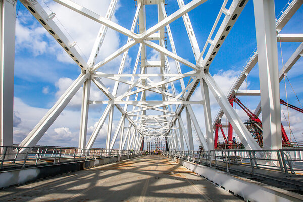 Каждая арка весит более 6 тысяч тонн, их собирали в стапелях на берегу со стороны Керчи, а затем по морю сплавляли к месту установки.