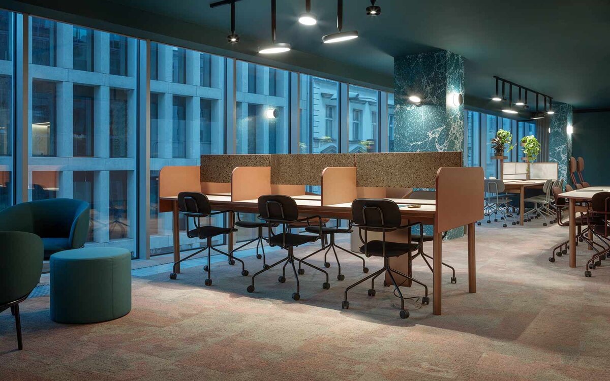 Будучи молодым членом ассортиментного портфеля фабрики ege, ковровая концепция ReForm уже доказала свою ценность в проектах по оснащению аэропортов, гостиниц, университетов и магазинов. Офис Nest (Польша). Клубное рабочее место для предпринимателей, компаний и творческой индустрии. ReForm Terra Ecotrust Ковровая пряжа на основе использованных рыболовных сетей
