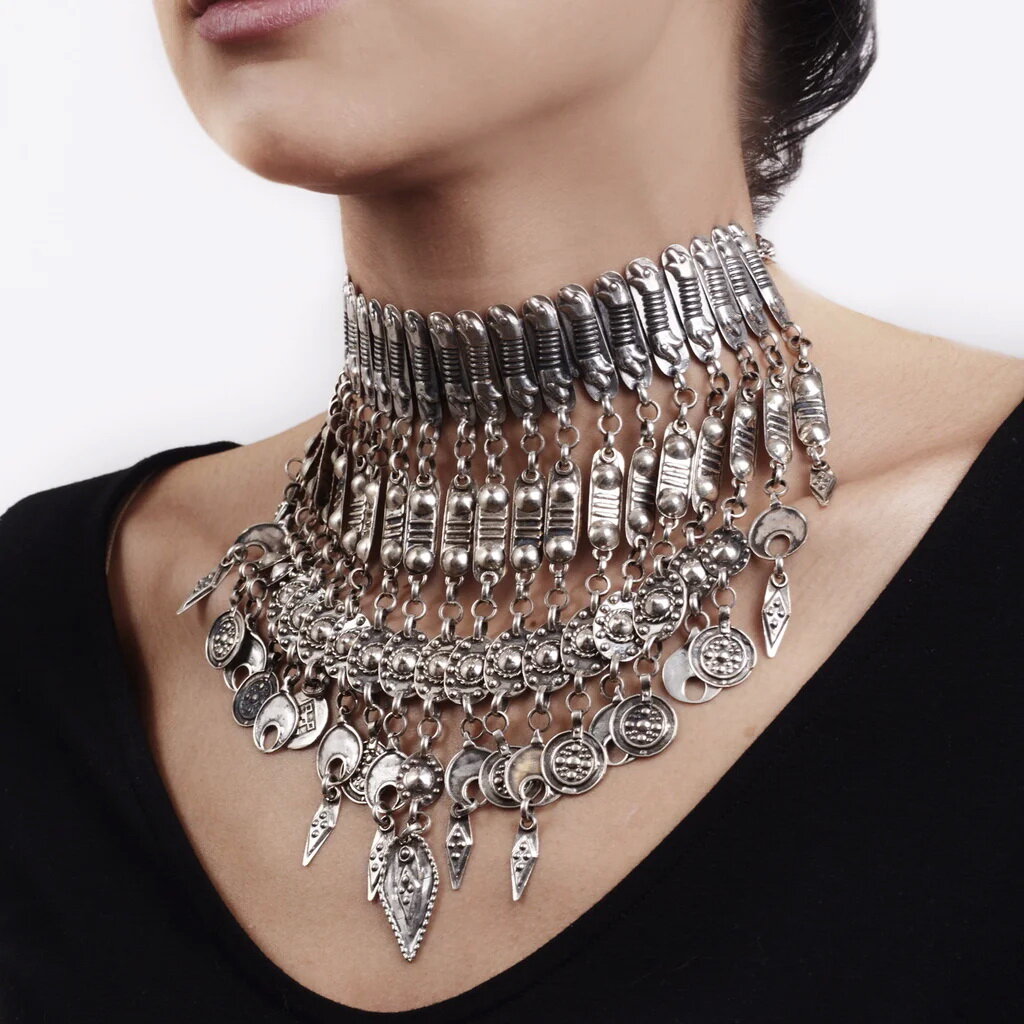 В это солнечное лето в моду входят колье-воротники. Это смотрится потрясающее. Стиль бохо очень экстравагантен и подходит к творческим натурам в любом возрасте. Бижутерия может быть как из драгоценных металлов и камней, так и из стекла и латуни. Главное – экспозиция и качество изделия. Многослойный, эклектичный, фактурный и немного забавный стиль бохо возник более полувека назад, и сегодня направление переживает вторую молодость, завоевывая сердца новых поклонников. А приверженцев стиля становится действительно всё больше, и эта популярность бохо оправдана: направление прямо противоположно кукольному, неестественному и анорексичному образу девушек из фэшн-индустрии. Тем не менее, стиль можно охарактеризовать как сексуальный, гармоничный и женственный. Новое дыхание этому стилю в одежде и украшениях придала известная модель Кейт Мосс. Ей просто надоело одеваться стильно и дорого и она позволила себе немного свободы в образе – задав новый тренд в современной моде. Без украшений этот с