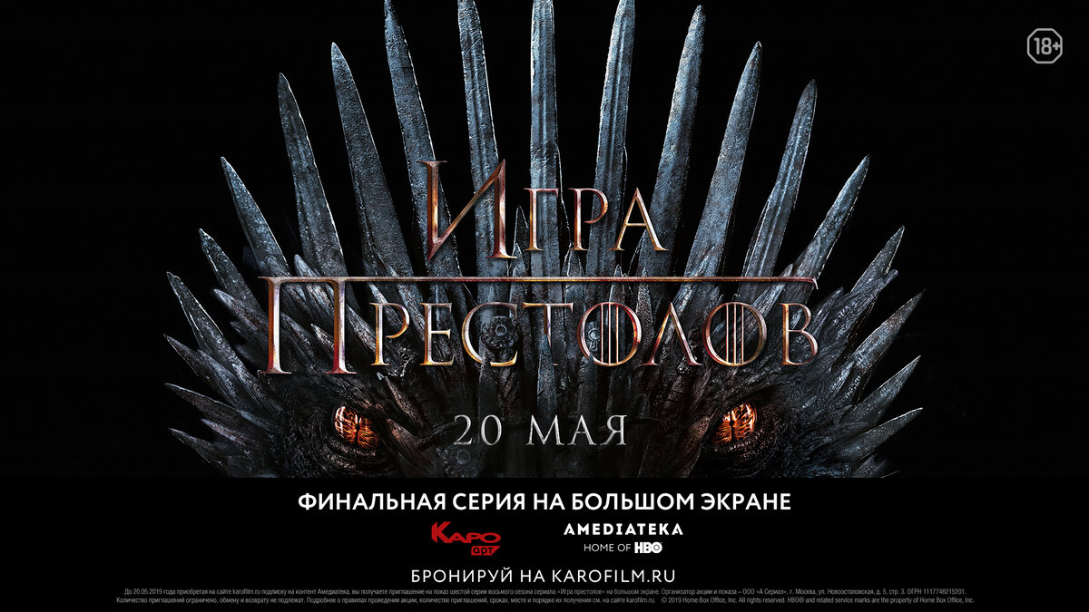 Сага завершится в понедельник, 20 мая. «Каро» и Amediateka организуют показы заключительной серии восьмого сезона «Игры престолов» в день российской премьеры, которая пройдет 20 мая. Посмотреть эпизод, над которым работал Дэвид Бениофф («Люди Икс: Начало. Росомаха», «Троя»), можно в Петербурге, Екатеринбурге, Казани, Самаре, Калининграде, Тюмени и Сургуте. Билеты уже продаются по ссылке. При покупке вы получаете сертификат на месяц использования сервиса Amediateka, который можно активировать до 20 мая. По подписке можно посмотреть все восемь сезонов «Игры престолов». Принимайте участие в нашем розыгрыше по ссылке и выигрывайте пригласительные на показ восьмой серии в Петербурге! Прочитать обзор пятой серии можно по ссылке. Следите за новостями о сериале в специальной рубрике «Игра престолов».