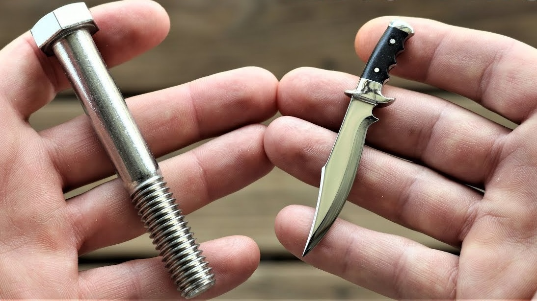 Обязательно посмотри, это идеально! Если у вас будет желание повторить данную красоту, то смотри, что тебе необходимо! С помощью болгарки спиливают ненужную шляпку С помощью молота и нагрева придают форму будущему ножу! Далее с помощью трафарета прорисовывают будущую форму мини-мини холодному оружию. И далее с помощью электрической затирки "сбривают" всё ненужное по контуру. В итоге у нас получается вот это. Главное не срезать ничего лишнего =)