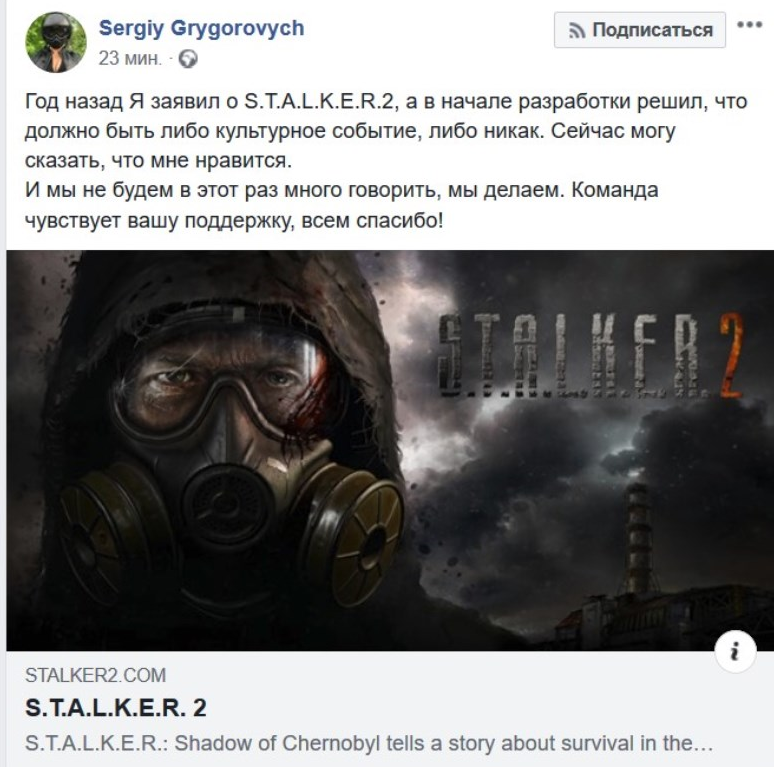 Ровно год назад, 16 мая 2018 года, один из разработчиков серии игр S.T.A.L.K.E.R. и основатель студии GSC Game World Сергей Григорович анонсировал разработку новой части игры - S.T.A.L.K.E.R. 2. Сегодня он напомнил об этом на своей официальной страннице в Facebook , и высказал благодарность фанатам. Даты выхода у S.T.A.L.K.E.R. 2 на данный момент нет, как нет ни игровых скриншотов, ни видео с геймпеем . Наверное, проект находится на очень ранней стадии разработки, хотя Григорович и заявляет, что студия активно занимается игрой, и как мы помнил S.T.A.L.K.E.R 2 уже почти готов, но из-за длительной заморозки игру начали делать наново. Спасибо за внимание 2