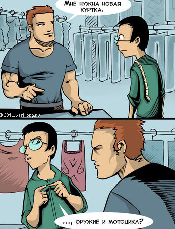 * * * * * Мальчик заходит в магазин и обращается к продавщице. Тетенька! Вы мне вчера сдачу неправильно дали. Ну так надо было сразу подойти… Хорошо, тогда 520 рублей я оставлю себе. * * * * * Заходит голубой в оружейный магазин. У вас пистолеты есть? - Нет А дробовики? - Нет. А карабины? - Нет. Выходит на улицу и видит на витрине все что спрашивал. Возвращается в магазин и возмущенно кричит - что вы имеете против голубых? Пистолеты, дробовики, карабины… * * * * * Клиент недовольный обслуживанием: Скажите, пожалуйста, где сидит ваш заведующий? А откуда вы узнали что он сидит? * * * * * Женщина заходит в оружейный магазин. Дайте мне Рюген .44-го калибра. Для защиты? Нет, для защиты у меня есть адвокат. * * * * * Святой отец выбирает пистолет. Батюшка, зачем он вам. Вы не представляете сколько людей не верят в Бога, но ведут себя так как будто хотят его увидеть.