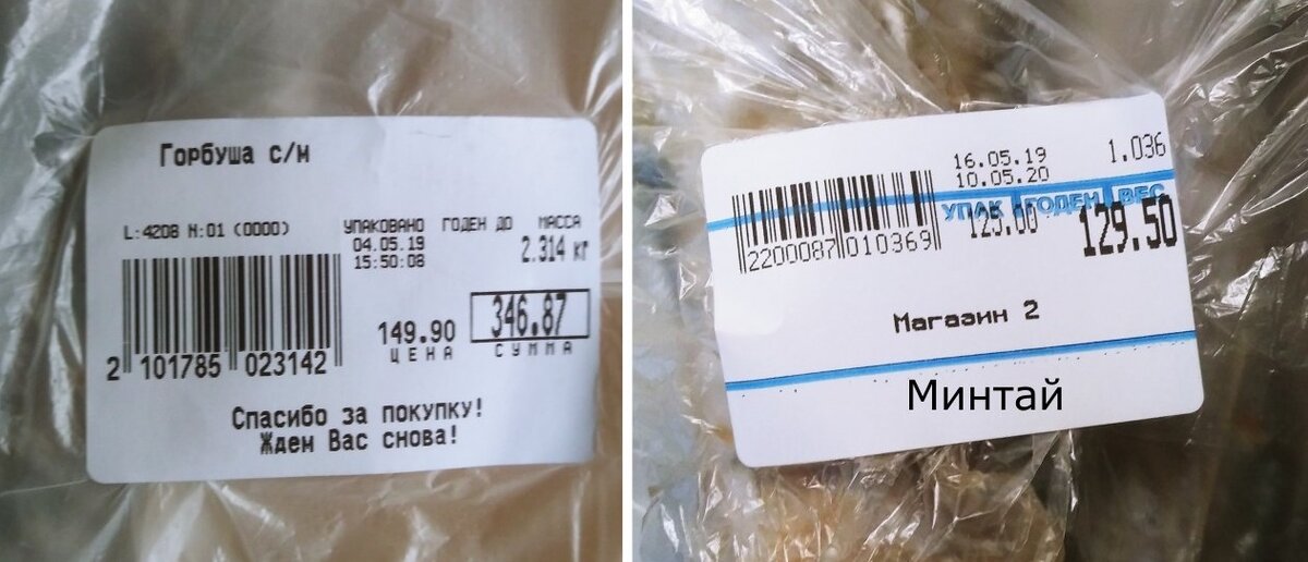 У меня была горбуша, две большие рыбины и около 700 грамм путассу. Позже я докупила три рыбины минтая, но чтобы не делать две микро-статьи решила совместить в одну. Для тех кому интересны цены и вес, прикрепляю фото ценников: Горбуша куплена в Светофоре, а минтай в местном "Окее", написано было что это свежий улов. Он был не замороженный. Горбушу разделал муж, не совсем аккуратно и красиво, но считаю, что это не беда. Минтай же традиционно разделываю я, да и по сути всю остальную рыбу тоже я, у меня это получается быстрее.