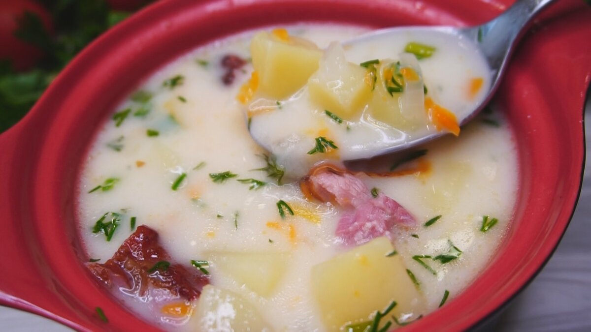 Сырный суп с копчёностями, люблю его за быстроту в приготовлении и вкус