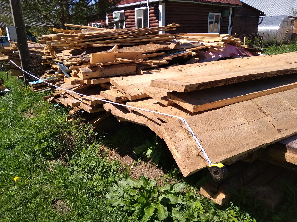 Часто возникает вопрос чем отапливать дачу или деревенский дом зимой. У меня такой вопрос не возникает, потому что уже 20 лет топлю кирпичную русскую печку в доме. Дрова кругом бесплатные и бесхозные нужно только оглянуться по сторонам. Недавно обсуждая данный вопрос в дискуссии, упомянул, натаскал 35 кубометров дров за три дня. Осталось распилить и поколоть - такая работа для меня в радость. Тут-же посыпались возмущенные комментарии, мол 35 кубометров натаскать за три дня невозможно, нереально и вообще я дурак и врун. Раз такое дело решил перепроверить. Измерить объем рулеткой, а не шагами. Может и ошибся немного. Поясню, эти конкретные дрова таскал не из леса, а с соседнего участка, где ломали старый дом( сруб). Так он выглядел в начале разборки В приватизации участвовали еще пару соседей. У меня образовалась вот такая куча, бревна лежат внизу под широкими досками. Измеряем рулеткой длину, ширину и высоту. Ширина 6 метров. Длина 4, 55 метра Высота 1, 1 метра ( на самом деле чуть