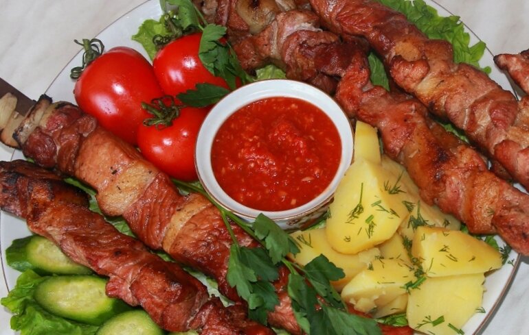 Шашлык - вкуснейшее блюдо, которое обожают практически все! Может быть эта любовь заложена в человеческих генах? Древний человек, лунная ночь, пещера, костер, дымок, мясо, сытость и умиротворение - так мне представляется картина зарождения обожания шашлыка человеком... Рецептов шашлыка в мире существует множество. Люди разных национальностей, взглядов и вероисповедания сломали немало копий, доказывая, что именно их шашлык самый лучший на планете, только они могут правильно замариновать мясо для шашлыка и т.д. Я думаю, что классический кавказский шашлык - один из самых вкусных и "правильных" и ведет свою "родословную" именно из тех древних времен зарождения человеческой цивилизации. Ну а если к классическому кавказскому шашлыку подать кавказский соус, то ..... то вкуснее на свете просто не может быть ничего...! Ингредиенты: Баранья или говяжья вырезка - 1 кг. Лук репчатый (средний) - 6 шт. Перец (черный молотый) - по вкусу Соль - по вкусу Помидоры (средние) - 4 шт. Аджика (порошок) -
