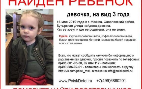 Беременная женщина привела в столичную больницу трехлетнего ребенка и оставила девочку. Полиция и волонтеры разыскивают родственников малышки. Так, в четверг, 16 мая, около 18 часов в одной из больниц Москвы обнаружили трёхлетнюю девочку. По предварительны данным, в лечебное учреждение её привела беременная женщина. Она оставила ребенка и скрылась в неизвестном направлении. Девочка рассказать о себе и своих родителях ничего не может. Врачи лечебного учреждения сообщил о произошедшем в правоохранительные органы. В настоящее время девочку отправили в лечебное учреждение, а её родственников разыскивают. Как сообщил президент фонда «Поиск пропавших детей» Дмитрий Второв, к ним в среду, 16 мая, обратились сотрудники полиции с просьбой помочь разыскать родственников двухлетней девочки, пишет «Вечерняя Москва». В настоящее время опекуны не найдены и ребёнок остается в медучреждении. Сведения о подкидыше активно распространяются в в интернете. — Это нужно для получения свидетельских показани