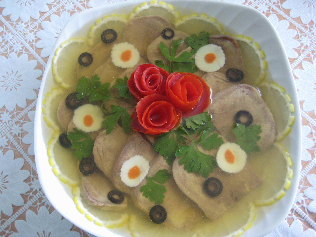 Заливной язык очень вкусное праздничное блюдо, является украшением любого стола. Заливное относится к русской национальной кухни. Хотя чаще готовят рыбное заливное, я предлагаю рецепт заливного языка. Ингредиенты: 1 язык (вес около 1 кг.) 25 грамм желатина (на 3 стакана желе) 1 корень петрушки 1 головка лука 1 морковь 2 яйца 1 шаг. Свежий язык сварить, положить в холодную воду, чтобы легче снять кожу. Чистить лучше с тонкого конца. 2 шаг. Положить язык в отвар в котором он варился, и охладить. 3 шаг. Язык нарезать тонкими кусками, положить на блюдо и украсить ломтиками сваренного в крутую яйца, огурца, моркови, листьями петрушки. 4 шаг. Желе приготовить на бульоне, полученном при варке языка, предварительно сняв с него жир. 5 шаг. Желатин замачивают в холодной воде (взятой в пятикратном количестве по отношению к весу желатина ). Бульон прокипятить на слабом огне в течение 5 минут. 6 шаг. Добавить замоченный желатин в бульон и помешивать бульон до закипания и полного растворения же