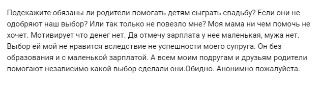 Чего только не прочитаешь в интернете! В одной из групп молодая невеста вопрошает у публики: Я думал, у меня волосы зашевелятся. Где мы свернули не там, если дочь считает маму главным спонсором своего брака. В этой истории мне отвратительна и вопрошающая невеста, и ее будущий муж, допустивший такую ситуацию. Он, как я понял, не против финансирования свадьбы из кармана бедной женщины. Во-первых. Как я понял из послания, все трое участников ситуации – люди, в лучшем случае, с доходом среднего уровня. На хер, б*ять, вам такая свадьба, на которую денег нет? Чтобы потом опять бедствовать и побираться по родственникам? А, ну конечно, чтобы фотки в инсту выложить и чтоб перед подругами стыдно не было. Во-вторых. Анонимная девушка не совсем понимает, что ее мама стеснена средствами. Видимо, в детстве с невесты пылинки сдували. Она яро уверена: такое поведение мамы из-за того, что жених ей не понравился. (Мне кстати, он тоже бы не понравился). То есть вариант, что мама просто не может дать день