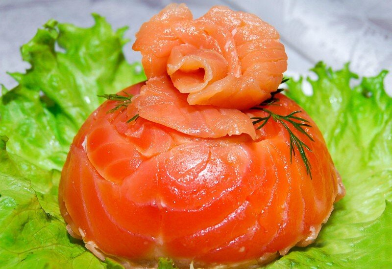 1. Проверяем филе на наличие косточек. Острым ножом нарезаем семгу на тонкие слайсы.