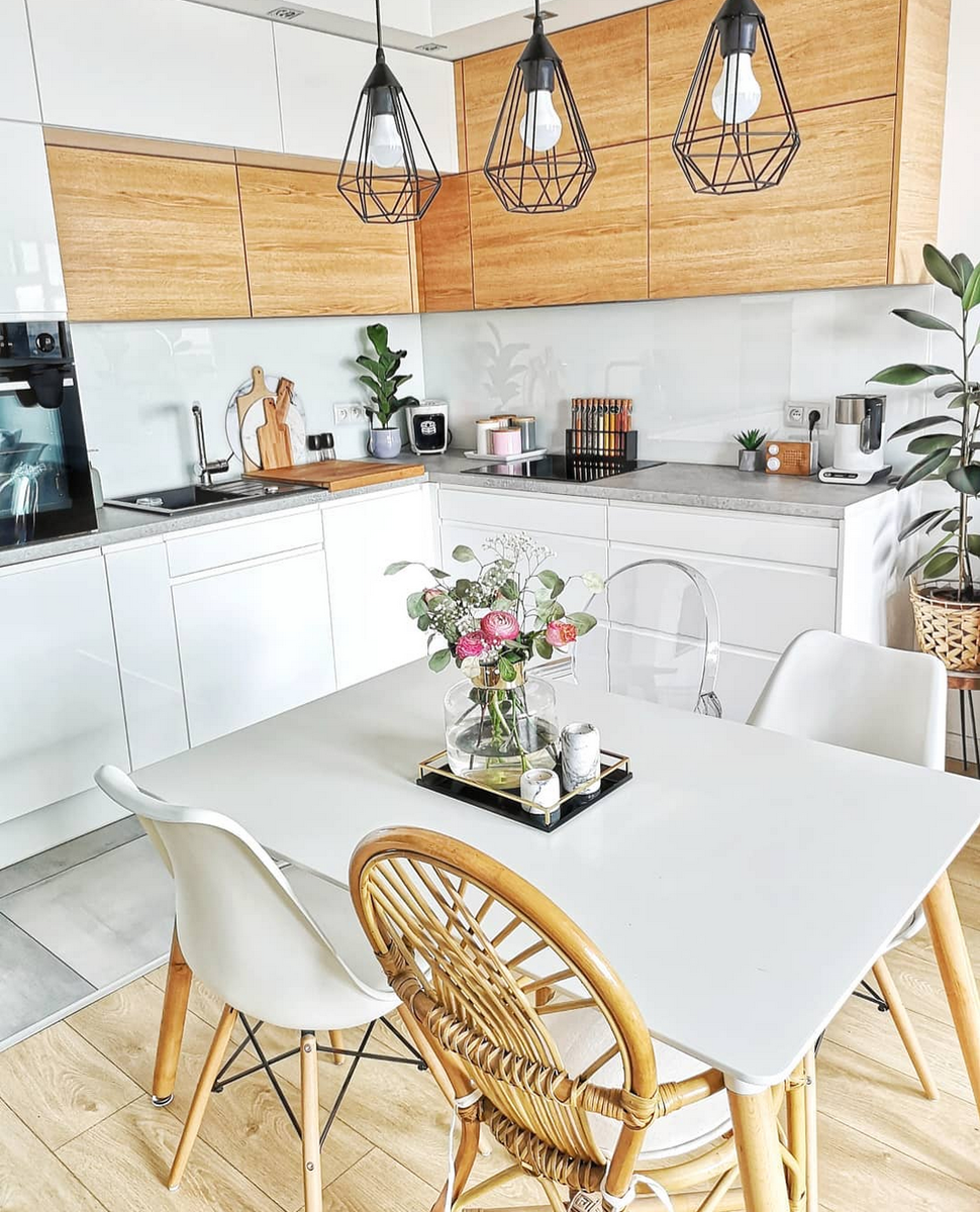 Тороплюсь поделиться с вами замечательной идеей оформления не только кухни, а всей квартиры. Случайно набрела на великолепную квартиру в стиле сканди. Милая девушка из Польши делится фотографиями своего дома в инстаграм, и мне ее интерьер так понравился, что даже очередную полезную статью отодвинула на завтра:) Кстати, чтобы не пропустить, не забудьте подписаться на мой канал о кухне. Итак, рассмотрим! 1. Размер кухни – 3,2х2,2 м Конечно, мне этот размер никто не говорил, я прикинула его, исходя из фотографии. Справа – две тумбы с выдвижными ящиками. По габариту они явно больше варочной панели, а она 60 см. Значит, тумбы примерно по 80 см. плюс столешница левой части, итого 2,2 м. Слева – пенал под встраиваемый холодильник (60 см), пенал для духовки (тоже 60 см), бутылочница 20 см, мойка 60 см и угловой стол 105 см. Итого 3,2 м. 2. Дизайн и функциональность кухни Цветовая гамма не только кухни, а всей квартиры: белый, янтарно-древесный и серый. Акценты: зеленый цвет растений и розовый