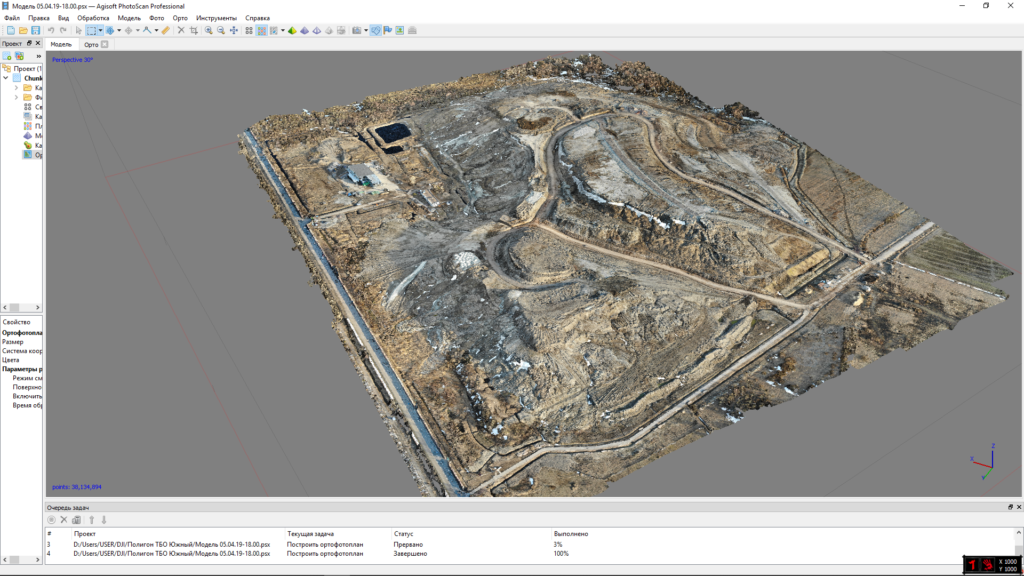 Добрый день. 5 апреля 2019 года в рамках испытания оборудования был произведен облет полигона ТБО Южный". Для информации — ТБО — это твердые бытовые отходы попросту мусор. Сейчас полигон мусор уже не принимает, ведутся работы по его рекультивации. То есть все засыпают грунтом. Поскольку мой маршрут проходил совсем рядом я остановился и решил посмотреть как много мусора накоплено на этом полигоне. Публикую краткий отчет и некоторые фотографии. Полигон, скажем так исследованное хранилище имеет размер приблизительно 700×800 м. То есть 56 Га (560 000 м2). Площадь огромная, надеемся батарей в запасе хватит. Погода великолепная солнце, ясно, ветра практически нет. Фото процесса не делаю но поделюсь результатами. Облет площади порядка 60-ти Га произведен на высоте 150 м. Время облета 40 минут, получено 372 ортофотографии. (Съемка строго в надир). Так выглядит полигон в виде «Плотного облака», построенного программой Agisoft PhotoScan. Построено более 38 млн. точек, обработка шла ночью поэто