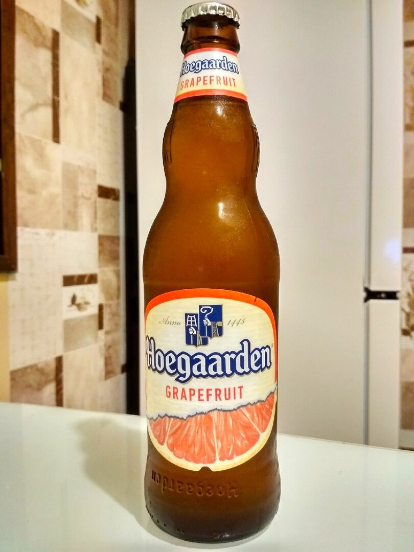 Пообещал подруге посмотреть вместе Евровидение. Поэтому заглянув с семьей в магазин я снова задержался в пивном отделе, так как без него смотреть такое крайне тяжело. Дабы не оказаться эгоистом, к своему "набору"я взял бутылочку Hoegaarden для нее. И с этих пор оно стало постоянной составляющей моего "набора". О производителе ничего интересного я не нашел, поэтому просто назову его имя - "SUN InBew Russia". Hoegaarden Grapefruit - нефильтрованный пшеничный пивной напиток. О том что это не пиво, а пивной напиток говорит его состав. Помимо стандартного для пива набора в нем содержатся добавки, такие как глюкозно-фруктозный сироп, ароматизатор натуральный "Сокосодержащая основа Грейпфрут-Апельсин", кориандр, кожура апельсина, яблочный пектин и регулятор кислотности (лимонная кислота). Как говорится "Понапихано, как у Тихона", но попробовать хочется. Внешне Hoegaarden Grapefruit выглядит довольно привлекательно. Открыв бутылку сразу ощущаешь работу всех добавок - яркий аромат цитрусовых