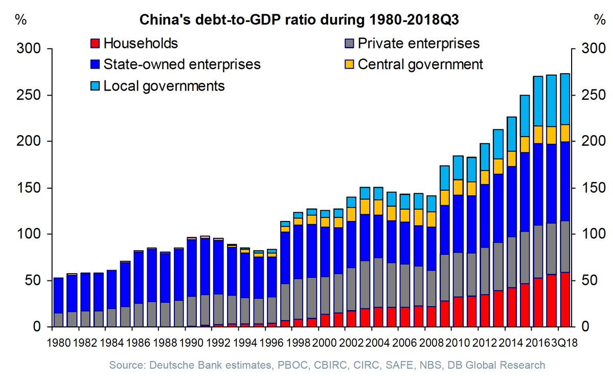 Все сегодня говорят о Китае, о сделке с США. А у меня созрел такой вопрос. Почему США "нанесли удар" в торговых отношениях только сейчас ? Только ли из-за личной позиции Трампа ? Есть мнение, что американская элита уже давно готовилась к этому противостоянию и Трамп является лишь "рубильником" включившим давно назревший процесс, который давно вызревавший сначала в виде появления идеи противостояния с Китаем у американских аналитиков, затем захвативший умы более широких масс в основном среди представителей республиканской партии. Самым интересным вопрос здесь является "случайность момента". Давайте посмотрим на одну из причин резкого роста Китая в последние десятилетия. А именно наращивание Китаем долговой нагрузки по отношению к ВВП: Как видим из графика с начала этого века в Китае наращивался долг центрального правительства и домохозяйств. Особенно сильно этот показатель наращивался с 2010 года. Но с 2016 года долг перестал активно расти. Это было связано с политикой китайского пр