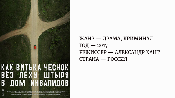 Фильм «Как Витька Чеснок вёз Лёху Штыря в дом инвалидов» Неожиданно кайфовый отечественный фильм. Для маньяков, таких, как Советчик и Вы, ничего оригинального в нём нет - он весь собран из кусочков других фильмов: весь визуальный ряд прямиком из сериала «Утопия», погружение в российскую глубинку и чёрный юмор про жизнь гопников, уже отсидевших в тюрьме, и ещё только собирающихся туда - это из Балабанова, работа с персонажами и подход к саундтреку - очевидно Николас Виндинг Рефн. При этом, как мы видим, авторы фильма вдохновились достойными примерами, и результат получился впечатляющий для отечественного кино. Кино вышло хлёсткое, безжалостное, полное страшноватого юмора, и при этом отлично снятое. Помимо очевидных визуальных ходов из «Утопии» и сносящего крышу саундтрека, собранного, как саундрек «Дилера» Рефна, в фильме про Витьку Чеснока есть две вещи, которых Советчик ну никак не ожидал найти в отечественном фильме, и которые мгновенно подняли фильм на головокружительную высоту - эт