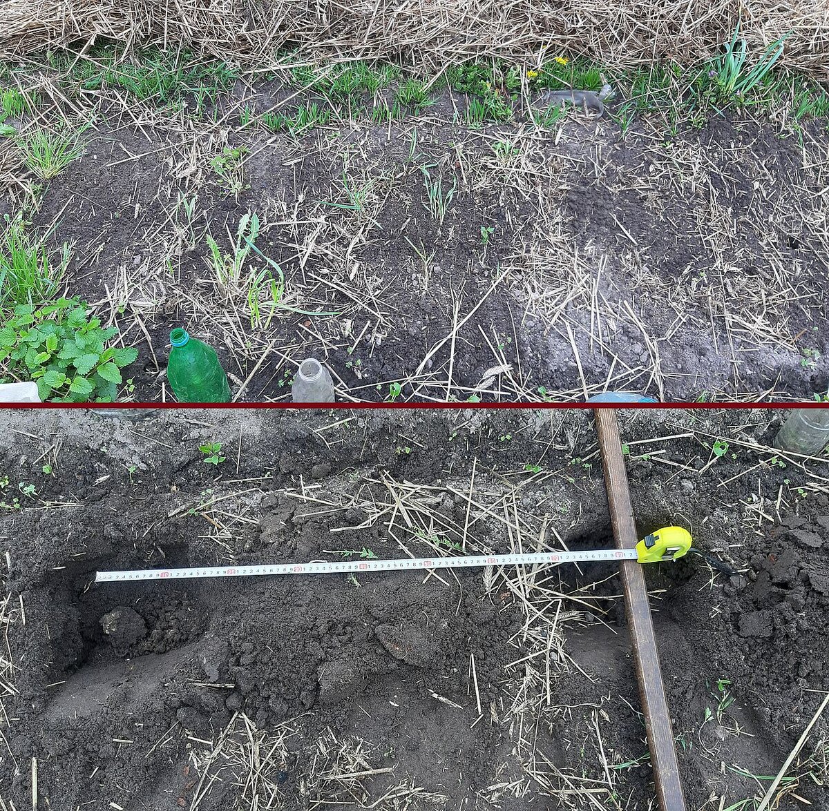 Каким способом/ соседи/ подготовка лунок/ что добавляю в лунки/ как раскладываю/ чем мульчирую/ Картофель- важная культура культура в нашей жизни. На даче всем хочется и повысить его урожай и ускорить созревание. Поэтому каждый сезон появляются все новые и новые способы выращивания картофеля. Обожаю выращивать под соломой. Клубни такие чистенькие, можно открыть их и выбрать большой и снова закрыть. Но этой весной холодно для такого способа, поэтому буду сажать классическим. На моём огороде я нашла местечко для 2 рядков картошки на грядке, где уже растёт цикорный салат эндивий. Он отдаст нам свои плоды раньше, чем созреет картофель и даст место на грядке для его разрастания. Я предпочитаю высаживать картофель после сидератов. Осенью на грядке росла горчица и была замульчирована под зиму соломой. Я дождалась, когда температура земли стала 10 градусов и занялась посадкой. Подготовка лунок Грядка размером 110 / 400. Салат занимает 1/3. Освободила землю от соломы и разметила места л