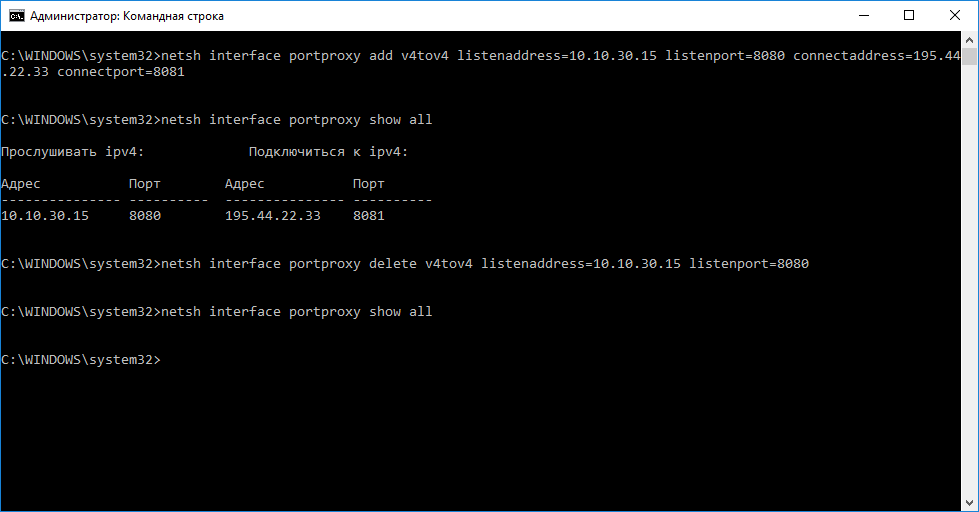 Начиная с Windows XP в операционной системе Windows имеется встроенная возможность перенаправления сетевых портов - port-forwarding. Более того, любое входящее TCP соединение можно перенаправить не только на другой порт, но и на другой IP адрес. Все настройки производятся через командную строку Windows с правами администратора. Запускаем командную строку с правами администратора. Добавить переадресацию C адреса 10.10.30.15 TCP 8080 на адрес 195.44.22.33 TCP 8081: netsh interface portproxy add v4tov4 listenaddress=10.10.30.15 listenport=8080 connectaddress=195.44.22.33 connectport=8081 Посмотреть список переадресаций netsh interface portproxy show all Удалить переадресацию C адреса 10.10.30.15 TCP 8080: netsh interface portproxy delete v4tov4 listenaddress=10.10.30.15 listenport=8080 Очистить все правила netsh interface portproxy reset Источник: