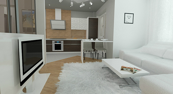 Мягкое зонирование и теплая цветовая гамма отделки позволили выстроить в квартире две жилые комнаты и при этом сохранить ощущение объема и свободы в жилом пространстве. Сведения о квартире: однокомнатная квартира площадью 53,3 кв. м в новостройке города Ростов-на-Дону. Владелец квартиры: молодой мужчина. Пожелания клиента: сделать из однокомнатной двухкомнатную квартиру с возможностью трансформации и перетекающими пространствами. План 1-комнатной квартиры после перепланировки. Целью проекта было создание лаконичной минималистичной квартиры для проживания одного человека. При планировании жилого пространства были реализованы интересные идеи для однокомнатной квартиры. С одной стороны, все жилые помещения объединены — комнаты словно перетекают друг в друга. С другой стороны, при необходимости спальню можно изолировать, стоит только задвинуть стеклянную перегородку. Чтобы визуально связать все помещения в единое пространство, весь интерьер квартиры окрасили в теплые природные тона.