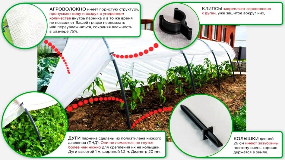 - Парник из дуг с укрывным материалом из спанбонда обеспечивает естественную вентиляцию воздуха, в отличие от парников из пленки.