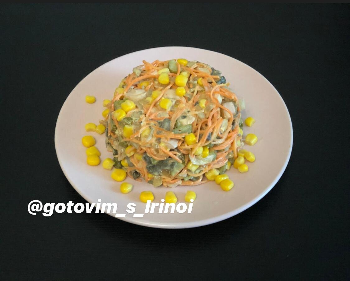 Салат с копченой курицей, корейской морковью и кукурузой. Вкусовая бомба)