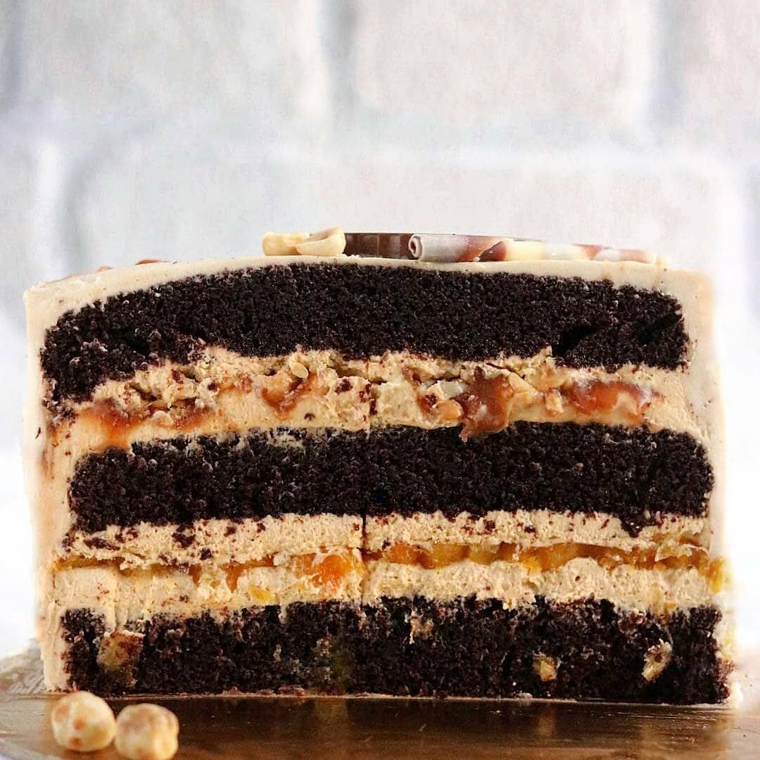 Ингредиенты: Тесто (на форму 16-18 см) мука - 250 гр., сахар - 300 гр., молоко - 100 гр., яйца - 2 шт., кофе горячий - 226 гр., растительное масло - 100 гр., какао - 60 гр., сироп - 50 гр., разрыхлитель - 5 гр., сода - 5 гр., Конфи из кураги: курага - 150 гр., сок апельсина или вода - 150 гр., Агар - 2 гр., стручок ванили. Ганаш на карамелизированном белом шоколаде: шоколад белый - 200 гр., сливки жирные - 137 гр. + 237 гр., Слой соленой карамели с орехами: сахар - 150 гр., вода - 40 гр., сливки жирные - 110 гр., сливочное масло- 50 гр., соль - 2 гр., фундук - количество см. сами, по вкусу. Крем для покрытия: крем-чиз - 300 гр., солёная карамель - 120 гр., сливки жирные - 40 гр. Как приготовить: Коржи: Сухие ингредиенты просеиваем, перемешиваем венчиком. В чаше соединяем масло и сахар, взбиваем. Вводим все яйца, перемешиваем. Добавляем половину сухой смеси, перемешиваем. Вливаем молоко, кофе и сироп. Перемешиваем и добавляем оставшуюся часть сухой смеси. Перемешиваем. Разогреваем д