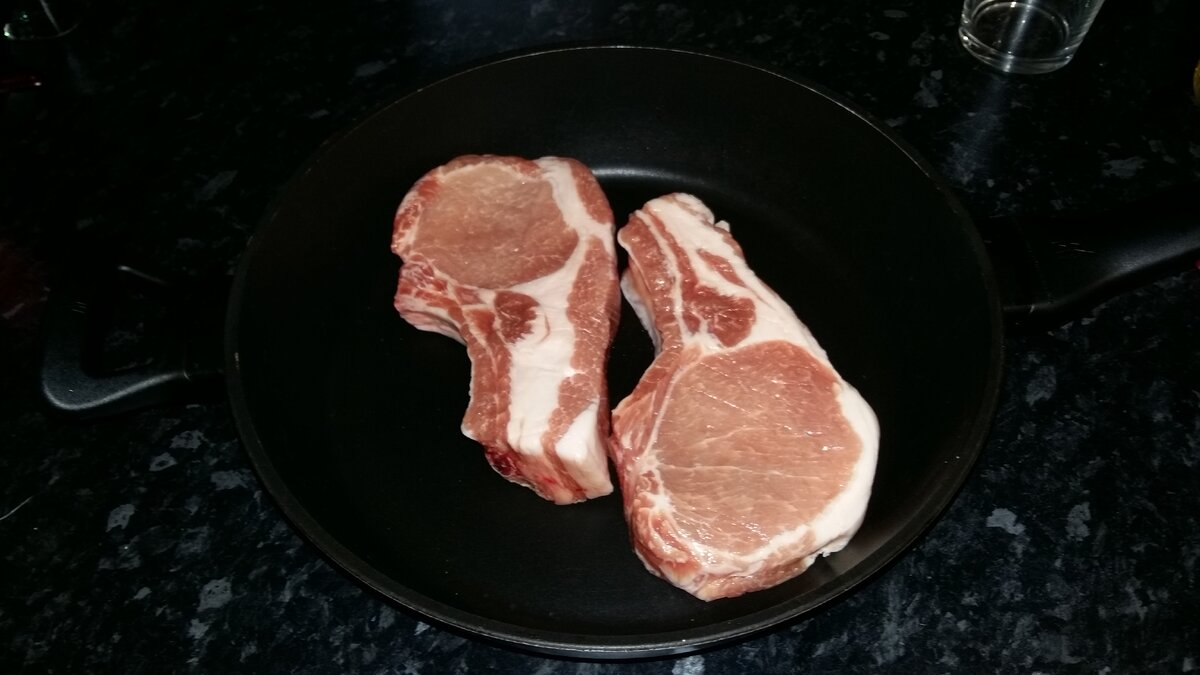Вы любите сочное, ароматное жареное мясо? Я очень! Люблю любое: говядину, баранину, свинину, курицу и т.д - я мясоед. И четно говоря не понимаю людей которые будучи здоровыми ограничивают себя по тем или иным убеждениям. Одно из моих любимых блюд это свиная корейка, мясо должно быть обязательно на косточке, ведь чем ближе к кости тем вкуснее. Ингредиенты: два стейка примерно по 350-400 гр оливковое масло 10 мл чеснок 10 гр черный перец 2 гр паприка 3 гр кориандр 5 гр морская соль 10 гр Стейки обмазываем оливковым маслом и приправляем специями, солью и дробленным чесноком. Кстати купил в "ОКее" недавно неплохое оливковое масло, и очень недорого, рекомендую(это не реклама). Хорошенько разотрите по поверхности мяса, сделав "массаж". Выдавливаем половинку лимона и оставляем мариноваться. Я обычно мариную около получаса. Сильно нагреваем сковороду до белого дымка и выкладываем стейки на сухую без масла. Мясо следует выкладывать отряхнув от лишних специй и чеснока. Стейки должны "запечатат