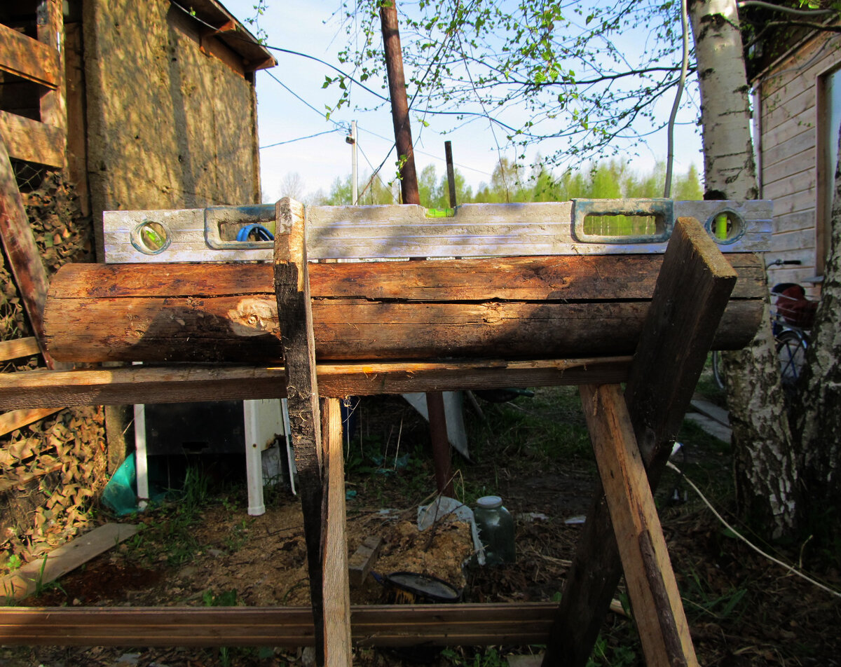 Всем привет! Хочу показать, как ровно спилить торец с неровного полена Понадобится уровень, угольник, ножовка. Пилить я буду на козлах, для начала выставлю их по уровню в горизонт. Выставил, закрепил, ничего не качается, все крепко. Как видно на фото оба торца спилены под произвольным углом, надо выровнять. В первую очередь сделаю упор из широкой доски, площадь упора должна быть больше окружности бревна. Распилил досочку, скрутил на два самореза, потом следует его закрепить. Можно так же на саморезы или струбциной. Следует выставить под 90 градусов к основанию, на которое будем размещать полено и прижимаем его край к упору. Противоположный край можно размечать. Для этого уровнем будем выравнивать вертикаль и фломастером поставим первую метку. Примерно так. По этой метке нужно закрепить по вертикали какую нибудь не толстую рейку. Я закрепил двумя гвоздиками. Эта планочка в дальнейшем будет являться упором для уровня при нанесении всей разметки. Вращая полено не забываем, что левый кра
