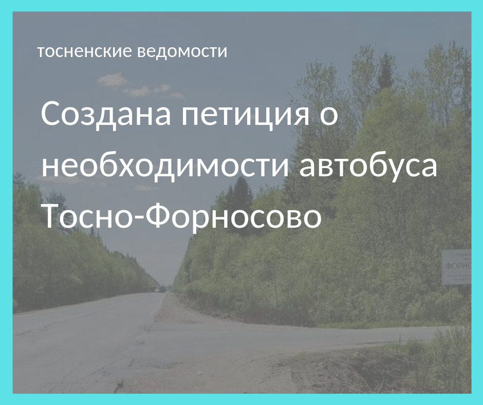Екатерина Владимировна создала петицию о необходимости регулярного рейсового маршрута Тосно-Форносово. Ее уже подписали 67 человек. Петиция адресованна Главе муниципального образования Тосненского района Ленинградской области Захарову Виктору Валентиновичу и Начальнику управления Ленинградской области по транспорту Постовалову Павлу Михайловичу.