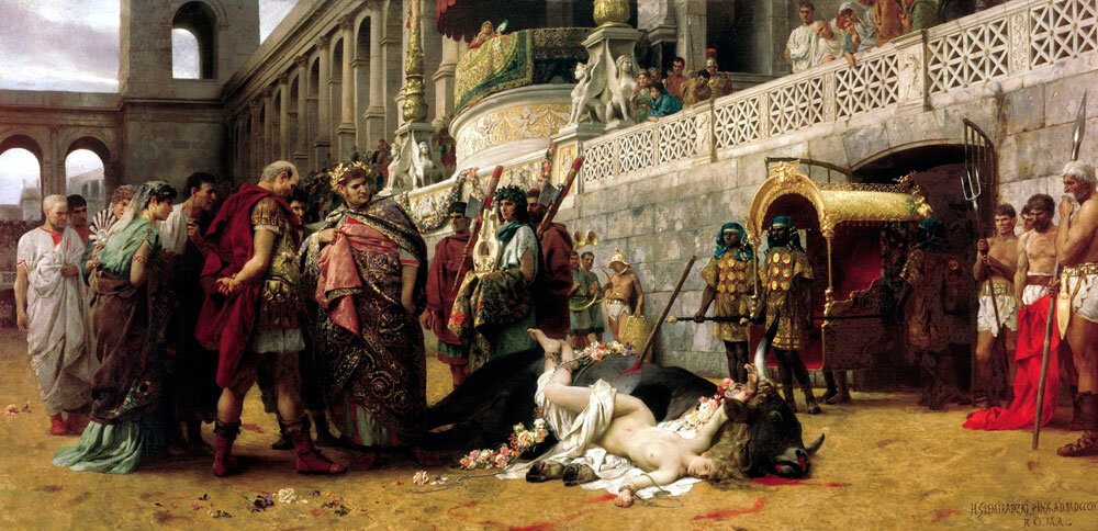 Нерон — римский император, последний из династии Юлиев-Клавдиев. В истории Нерон прославился, как жестокий правитель с, мягко говоря, необычными привычками. Отец - Гней Домиций Агенобарб, римский политический деятель. Мать - Агриппина Младшая Когда весть о рождении Нерона сообщили его отцу, тот воскликнул: "От меня и Агриппины ничто не может родиться, кроме ужаса и горя для человечества!»". И он был прав. Но сегодня речь пойдет только об одном из ужасных "развлечений" кровожадного императора. Известно, что Нерон считается первым государственным организатором гонений на христиан. И расправы над первыми христианами были жестокими. Художник Генрих Семирадский на своей картине «Христианская Дирцея в цирке Нерона» изобразил "театрализованное" представление по наказанию девушки- христианки. Исторически сюжет картины соответствует 60-м годам I века нашей эры — второй половине правления римского императора Нерона. Казнь заключалась в том, что римлянок-христианок привязывали к сви