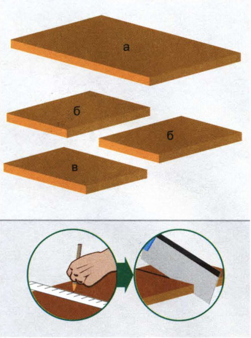 Если после строительства или ремонта остались обрезки досок, то за полчаса из них можно собрать табуретку, которая обязательно пригодится в быту и хозяйстве. Инструменты для работы: угольник, карандаш, ножовка, дрель, шуруповерт. Небольшой стул для сада своими руками Из доски толщиной не менее 25 мм и шириной 150 мм нарезаем: сиденье длиной 400 мм (а), две ножки длиной 200 мм (б), перемычку длиной 300 мм (в). Размеры можно заложить свои. Совмещаем верхние края ножек (б) с боковой гранью перемычки (в), фиксируем детали посередине саморезами 50 мм. Далее сверху устанавливаем сиденье и крепим саморезами. Затем красим или лакируем.