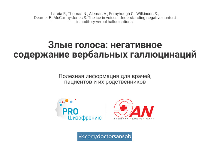 Вербальные галлюцинации (ВГ) встречаются в целом ряде психических расстройств, таких как шизофрения, биполярное аффективное расстройство, посттравматическое стрессовое расстройство, пограничное личностное расстройство и др., и значительно ухудшают качество жизни пациентов. ВГ также возникают у части населения без психотического опыта. Возникает вопрос, почему одна группа людей может справиться с психотическим опытом и остаться частью общества, а другая — страдает от социального и функционального несоответствия и нуждаются в психологической реабилитации. В ряде случаев возможно разграничить клинические случаи и неклинических по тому, какие эмоции несёт голос: отрицательные или положительные. Согласно статистике, в 88% случаев пациенты, слышавшие негативные голоса, относятся к клинике. В 100% случаев при шизофрении голоса имеют отрицательный характер, в 93% — при диссоциативном расстройстве и всего в 53% — у здоровых лиц. Негативное содержание произнесённого имеет большое значение в проц