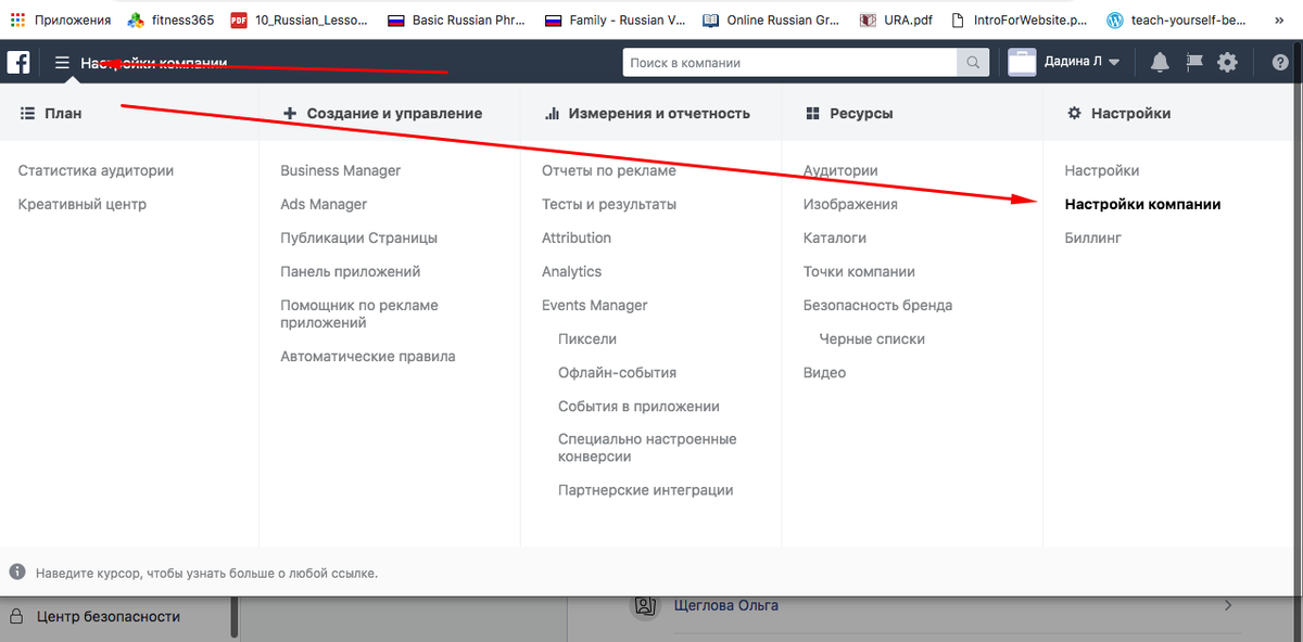 Как предоставить доступы к Бизнес менеджеру Facebook и рекламному аккаунту 1) Заходите в Бизнес-менеджер https://business.facebook.com выбираете нужный. 2) Заходите в настройки Бизнес-менеджера а) Открываете ссылку выше