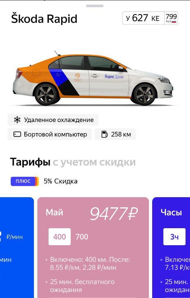 30 апреля в 18:00 Яндекс.Драйв открыл бронирование автомобилей по специальному тарифному плану «Май». Так, автомобиль класса «На каждый день» (Skoda Rapid, Kia Rio X-Line, Renault Captur, Volkswagen Polo и др.) обойдётся вам в Москве почти в 9,5 тысяч рублей (~150$) с учётом скидки (автомобиль бронируется за вами до 6 мая, т.е. если брать 30 апреля, 5 полных суток), с включенными 400 км пробега: Получается 23,75 руб/км. Получается дороже и менее выгодно, чем брать тот же самый автомобиль автомобиль на 3 суток (9 тысяч рублей и 450 км пробега, 150х3) 20 руб/км: Либо вы можете взять пакет с пробегом в 700 км, он будет стоить почти 12 500 рублей с учётом скидки: Сравним с суточным тарифом: выходит четверо суток и 600 км включённого пробега, здесь же мы получаем 5 суток и 700 км пробега (17 руб/км). Получается выгоднее, чем 4-ро суток. Но есть и нюансы: за пределы Московской области вам всё равно не выехать, встаёт вопрос — где выкатывать эти 700 км, и самое главное — зачем? Ездить на д