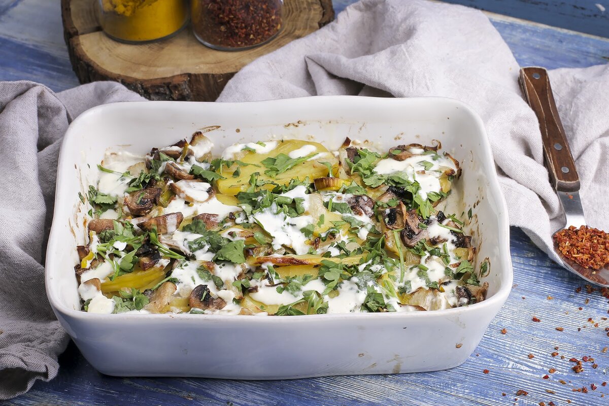 Кто не любит запеченную картошку с грибами? Не знаю таких :) В постном меню без нее не обойтись. Настало время попробовать любимое с детства сочетание в новой интерпретации. Картофельный гратен с цукини и кокосовым молоком! Это необычно, свежо, но очень вкусно. Пробуйте скорее! Картофель 550 г Шампиньоны 150 г Лук репчатый 1 шт Цукини 1-2 шт Тмин 0.5 ч.л Кокосовое молоко 200 мл Лук-порей 150 г Форма алюминиевая прямоугольная. 267х209х49 1 шт Время приготовления 50-55 мин + 10 мин на подготовку