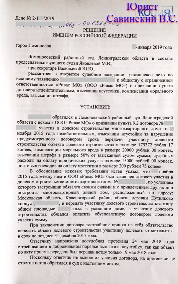 В продолжение ранее опубликованной статьи о пунктах договора, которые ущемляют права портебителя, которую Вы можете изучить по ссылке https://zen.yandex.ru/media/id/5b4f736ce3f57400a882e24f/punkty-dogovora-uscemliaiuscie-prava-potrebitelia-5c9b4aab3bbd5d00b356a448 , я решил опубликовать ещё одно из решений суда, где мне удалось признать пункт договора о договорной подсудности недействительным. Одно из Юридических лиц ПАО "Группа компаний ПИК" ООО "РИВАС МО", являющееся застройщиком ЖК "Путилково", включило в договор пункт следующего содержания: "Стороны пришли к соглашению, что рассмотрение споров не урегулированных Сторонами в претензионном порядке, будет происходить в суде общей юрисдикции по месту нахождения Объекта долевого строительства." При этом сам дольщик проживает и зарегистрирован в Ленинградской области, к тому же суды в Москове и Московской области, где находится объект, очень сильно снижают неустойку. Было решено судиться в Ломоносовском суде Ленинградской области, зая