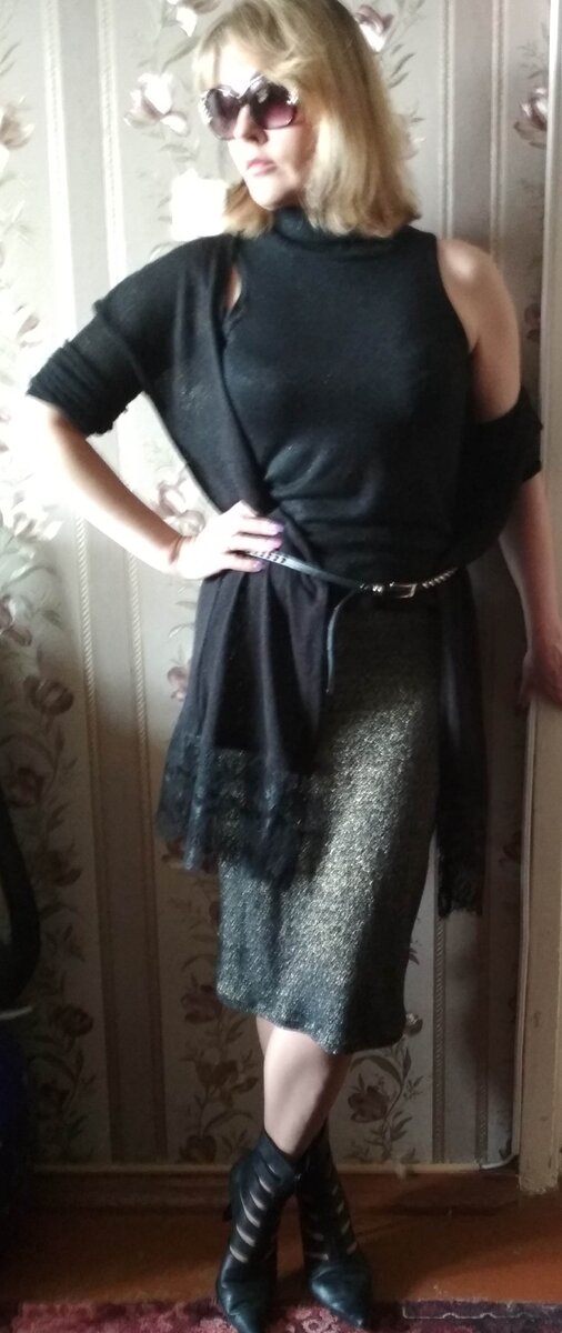 Плюс 28 в мае, я уже не помню, когда такое было за последние пол-века) Посмотрите, в чем я вышла из дома, совершенно не подозревала, что смогу так запариться. Что здесь из Секонда? Да все, кроме ремня. Цена вопроса - 850 рублей. Ботики - 250 рублей (опять же - спасибо скидкам). Фирма Vigorous (кстати, Вы знали, что это Россия? Вот и я нет, думала - Заграница))))). Вообще, ботильоны нужно носить с черными колготами, т.к. они, как бы обрезают ногу, укорачивая ее. В данном же случае, я пренебрегла этим правилом, дабы сделать акцент на прорезях. Далее - водолазка без рукавов - 150 рублей и прекрасный жакет, или как его там обозвать, с красивым кружевом по низу - 300 рублей. Дополняет все это совершенно новая (хоть и из секонда) трикотажная с кожаным кантиком юбка TopShop за 150 рублей. На этом пока все. Пойду переоденусь, а то рискую получить тепловой удар. И в конце, для тех, у кого портится настроение, при виде вещей из Секонда, чтобы его поднять - моя маленькая шутка - сюрприз. "Отжала