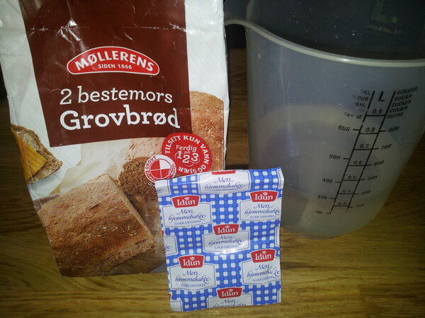 Я решила попробовать испечь, находясь а Норвегии, хлеб. Пожалуй, не по причине дорогой цены его в магазине, поскольку едим мы его не очень много и он погоду бюджету не делает. Хотя стоимость здешнего хлеба впечатляет - 18-30 крон, что примерно соответствует 120 - 240 рублям. В месяц мы покупаем не больше 3-х буханок. Храним обычно в холодильнике. Свободного времени у меня предостаточно, особенно в дождливую погоду, которая в Западной Норвегии постоянно. Вот и пришла в голову мысль попробовать заняться хлебопечением. Дрожжи здешние сухие мне нравятся. Приобрела в магазине готовую смесь для хлеба. Все инградиенты обошлись в 12 крон. Положено замешивать на воде, но я решила добавить все же молоко и яйцо, взбив предварительно эту смесь. Взяла для первого раза половину объема муки в пакете, рассчитанном на 2 порции выпечки. Дрожжи развела в 50 г теплой воды с сахаром и дала постоять около 5 минут. Замесила тесто. Поскольку смесь - с добавлением ржаной и гречневой муки, тесто не очень прив