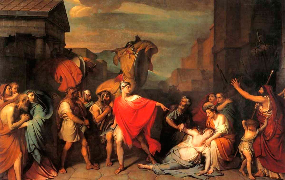 Эта трагическая история произошла давным-давно, еще в VII в. до н. э. Два города - Рим и Альба-Лонга - соперничали за звание главного города Латинского союза. Но междоусобица ослабила бы оба города, и распря могла привести к тому, что оба эти города поработили бы этруски. Поэтому решено было выявить победителя единоборством нескольких избранных солдат. На бой вышли три брата Горация из Рима и три брата Куриация из Альба-Лонга. Сражение было жестоким. Братья Курации были убиты, из трех братьев Горациев остался один. Он и вернулся победителем в Рим. И убил свою сестру Камиллу. Об этом и рассказывает картина русского художника Фёдора Антоновича Бруни " Смерть Камиллы, сестры Горация". Огромное полотно (ширина его более пяти метров) Федор Бруни, русский художник итальянского происхождения, написал в 25 лет во время своего путешествия в Италию. Художник выставил свое произведение на Капитолийском холме для всеобщего обозрения, и оно прославило молодого автора. Затем картина