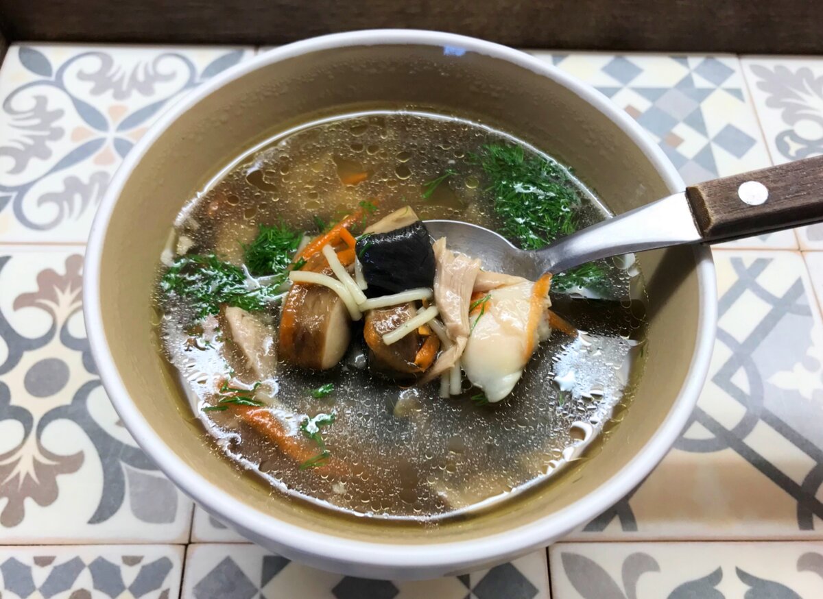 Превосходный, наваристый и ароматный супчик на обед или ужин. Приготовьте с вечера, чтобы суп постоял ночь и стал еще более вкусным. Ингредиенты: Куриное бедро с ножкой Три королевских шампиньона (портабелло) Половина стакана вермишели Лук Морковь Соль, перец и лавровые листочки Как приготовить грибной суп: 1. Подготовьте необходимые ингредиенты. 2. Положите курицу в кастрюлю и залейте фильтрованной водой. Доведите до кипения и поварите 5 минут. Затем слейте воду и снова наполните фильтрованной. Добавьте соль, перец, лавровый лист и очищенный лук. Верните на огонь и доведите до кипения. После закипания убавьте огонь на средний и варите один час. 3. Натрите морковь на терке, а грибочки крупно нарежьте. 4. Когда бульон сварится, достаньте из кастрюли курицу, лук, перец горошком и лавровый лист. Подождите пока курочка остынет. Снимите с бедра кожу и отделите мясо от косточек. Порвите на волокна. 5. Добавьте в бульон грибы, морковь и вермишель. Перемешайте и варите еще 15 минут на среднем