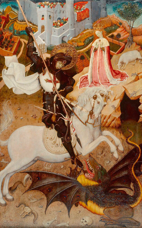 "Святой Георгий и Дракон" написана в 1434-35 годах. Изначально она была центральной частью алтаря, посвященного святому Георгию, который был сделан для часовни дворца каталонского правительства в Барселоне. Сейчас она хранится в Чикагском институте искусств, США. Сказание сообщает, что в окрестностях города Бейрута близ Ливанских гор в озере жил дракон, который терроризировал город . Чтобы успокоить зверя, город предлагал ему по две овцы в день. Но когда в городе кончились овцы, жители были вынуждены жертвовать молодыми людьми и девами, которые были выбирались по лотерее. И вот пришла очередь к дракону отправ