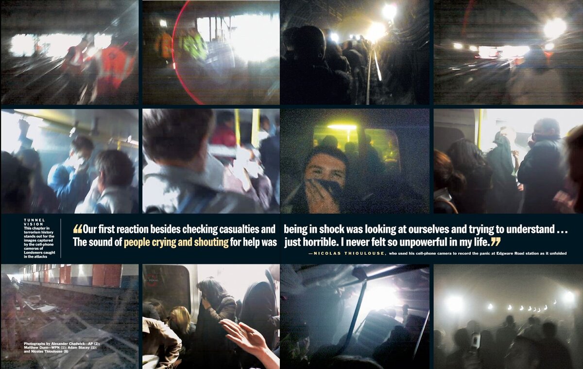 После террористической атаки в Лондоне в июле 2005 года журнал TIME опубликовал эту серию снимков с мобильного телефона, сделанных в лондонском метро. Тогда я в первый раз как редактор столкнулась с таким количеством фотографий, сделанных обычными очевидцами, которые пытались запечатлеть развитие событий с помощью своих телефонов.