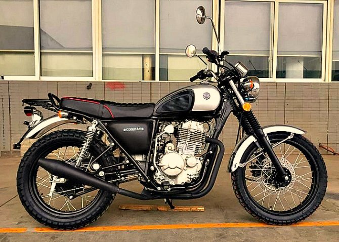 Китайцы приготовили небольшой подарок российским любителям мотоциклов в ретро-стиле. В интернет-магазинах, торгующих мототехникой из Поднебесной, появился классический мотоцикл COMBAT 400 — точная копия простого, но чрезвычайно надёжного байка Honda CB400SS, производство которого было начато в 2001 г. Внешне обе эти модели отличаются наличием масляного радиатора у «китайца» (у «Хонды» только воздушное охлаждение) и шильдиками. У COMBAT 400 такой же 1-цилиндровый 4-тактный мотор объёмом в 400 куб. см., сблокированный с 5-ступенчатой КПП, как и у Honda CB400SS, но его характеристики немного отличаются. У японского ретро-классика мощность составляет 29 л. с., а крутящий момент — 31 Нм. Китайский клон выдаёт 27л. с. и 29 Нм. Соответственно, у него немного выше тяга «на низах» и чуть поменьше расход бензина. В остальном мотоциклы одинаковы: высота по седлу — 780 мм, вес — 150 кг, запуск мотора как кнопкой, так и кикстартером. Передний тормоз — дисковый, задний — барабанный. COMBAT 400 предл