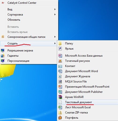 Создаем простой текстовый документ, проще говоря блокнот. Нажимаем правую кнопку мыши и выполняем действия ниже по рисунку.