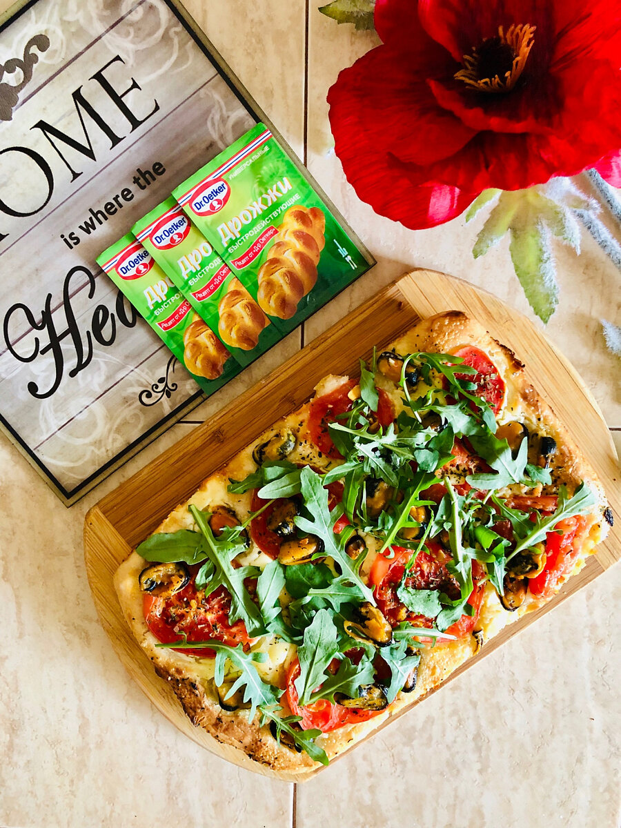Рисовая лепешка с маскарпоне, томатами, мидиями и рукколой