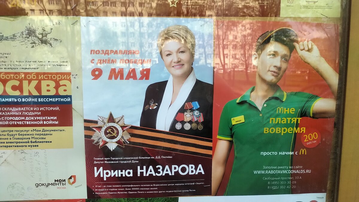 А у нас в районе депутат МГД Ирина Назарова, которая хочет избраться вновь в Мосгордуму, продолжает пиариться на теме дня Победы Вот такие поздравительные плакаты под стеклом появились на стендах объявлений во многих домах. Поздравляет с Днем Победы. Парадная фотография с орденами. Награждена Орденом Мужества, орденом Почета и множеством других государственных наград России сообщает плакат мелким шрифтом. Более 300 000 спасенных жизней. Короче, подвиги матери Терезы просто меркнут на этом фоне. Нет, я не ставлю под сомнения профессионально-медицинскую квалификацию главного врача клинической больницы №57 имени Плетнева, но вот это неуместное выпячивание общих заслуг всех ее сотрудников - за личное достижение, мягко говоря, раздражает. А цель у всей этой печатной показухи только одна - примелькаться лицом для избирателей. Для этого и с первым мая всех поздравляла. Правда, тогда получилось как-то грубо и сердито: просто лицо без подписи. И не под антивандальным стеклом. Поэтому ее плак