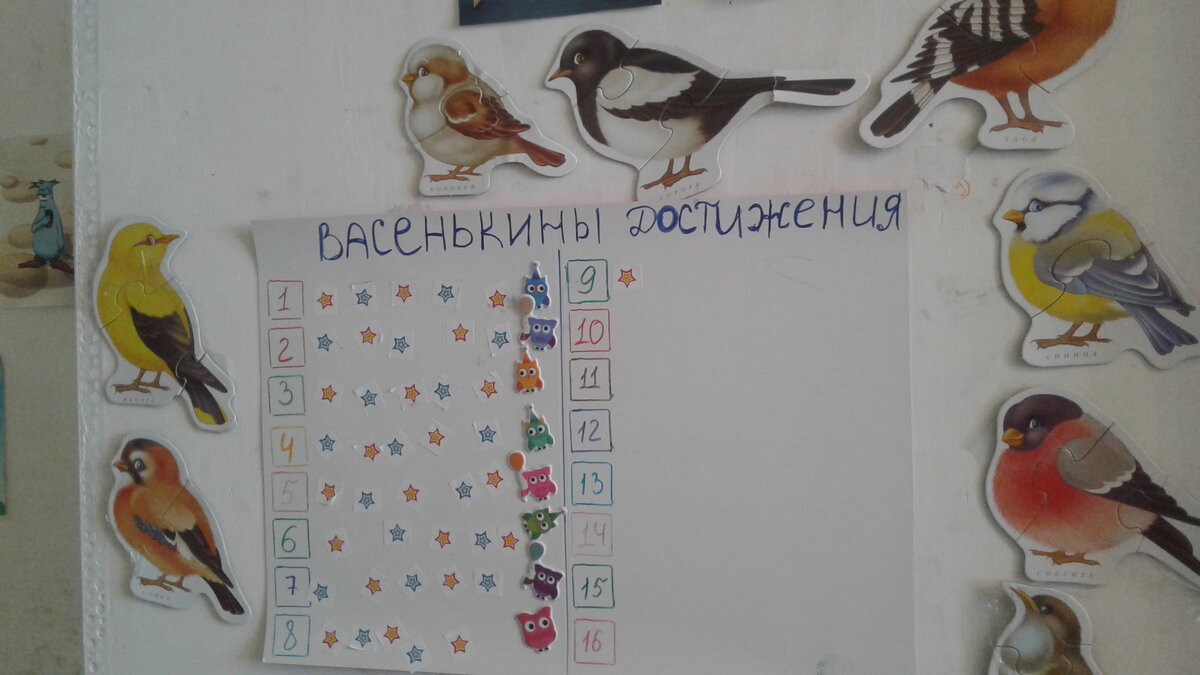 Сын просто обожает птичек. Я уже писала о нашем поощрительном плакате. За каждый добровольный поход на горшочек сыну вручалась наклейка-звёздочка, за 5 звёздочек большая наклейка и птичка. Вот так выглядел наш плакат... Когда плакат заполнился звёздочками, встал вопрос о том, что же теперь делать с эими птичками, чтобы они оставались интересными ребёнку. И вот что мы придумали... У нас есть магнитная доска и магнитный винил (продаётся в онлайн магазинах фетра). На каждую птичку я наклеила кусочек винила, в соответствии с размерами птички, так, чтобы она не падала с магнитной доски. Магнитный винил хорошо клеится на бумагу и заламинированную поверхность, но со временем может отходить. Лучше сразу приклеить его с помощью клеевого пистолета. Птички- пазлы разделила на части и к каждой приклеила винил. Теперь пазлы можно собирать прямо на доске. Потом выяснилось, что птичкам нужно дерево с веточками-его я вырезала из обычного картона, заламинировала и тоже приклеила винил. Также сд